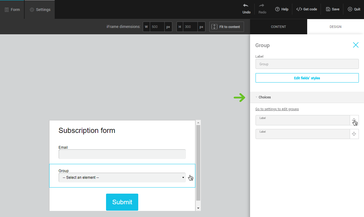 You can control the order in which groups are displayed on the form, by clicking on the group in the list. In the right sidebar, you will see the groups you’ve selected under the Choices section. To reorder them, drag them by clicking the movement icon and keeping your finger on the mouse button.