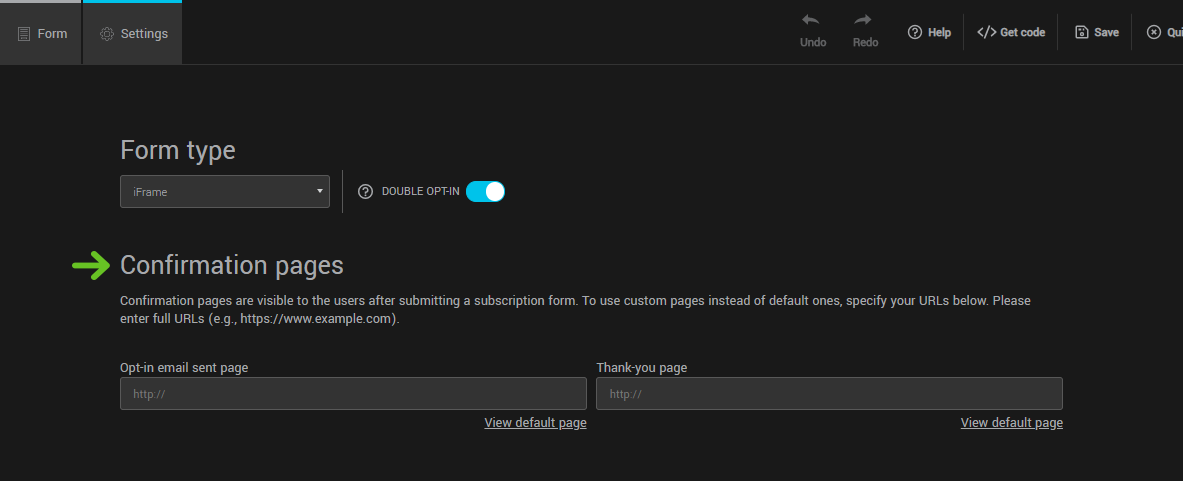 To use your own confirmation pages rather than the default ones, you must first create them on your website. Note the url of each page and assign it to your form in the appropriate field. The personalized pages will be used only for the current form.