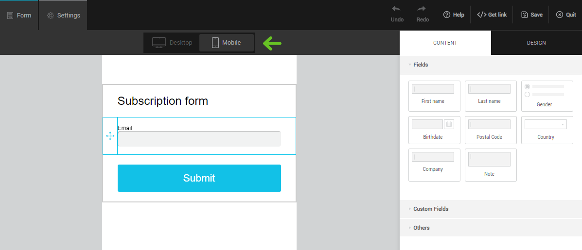 When you create a hosted form, you can switch between desktop and mobile preview in the top bar. Any changes made in either, are applied to both.