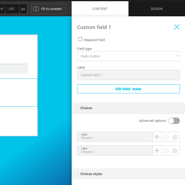 You can change the style of the response choices (font, size and color) by expanding the menu of the same name. For the sake of consistency, if you modify the response choice style for a field, the change will also be applied to all other fields of this type (e.g. check boxes or radio buttons). It's not possible to change the style of the drop-down list response choices.