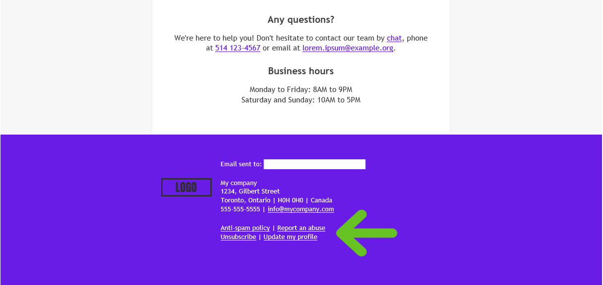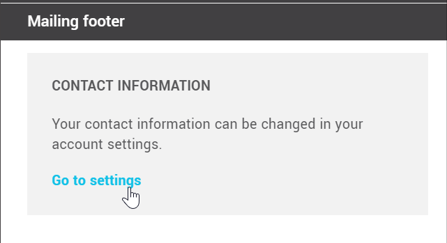 To modify or complete the contact information of your organization in the footer of your mailings, go to . Don't forget to save your template before leaving the editor. The changes will then be applied to all future scheduled mailings.