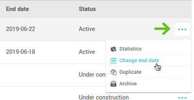 2. Clink on the action menu at the right of the survey and select "Edit the end date".