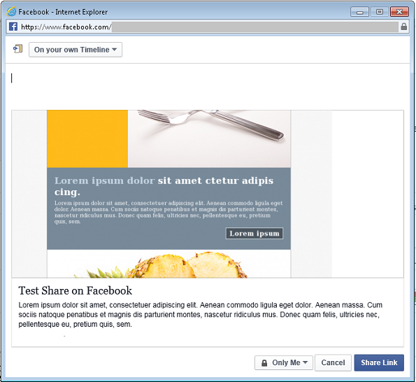 - Once connected, you can share the online version of your mailing. You can enter a message, choose who to share the publication with and then click "Share Link". Facebook will automatically generate a portion of the image and the description of your mailing.
