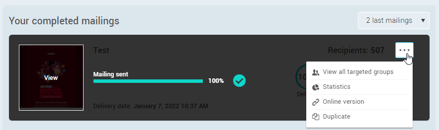 - To share your last mailing, go to your "Dashboard" Click the action menu "..." and choose "Statistics".