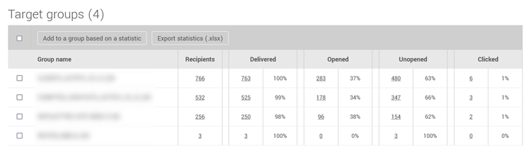 If you sent to multiple groups, it may be interesting to compare the data for each one. This is shown in the Target groups table, under the mailing statistic graphic. You can click on the figures outlined in the table to access detailed information for each statistic.