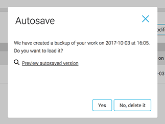 If you do exit the editor without saving your more recent progress, you will be able to see your most recent autosaved copy by clicking on the "autosaved" link in your template list. When you continue editing your template, you be asked if you would like to use or delete your autosaved copy. You have the choice to use your last manually saved copy or your last autosave.