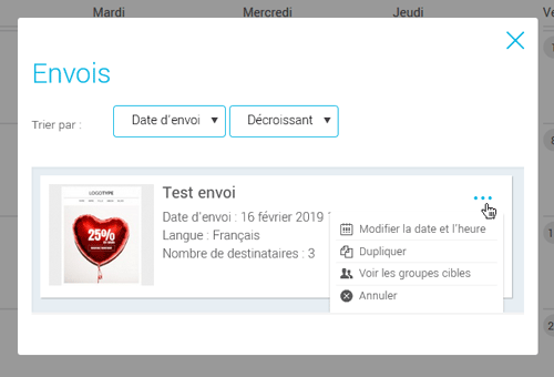 * Toutes les options précédentes sont également disponibles à partir du menu d'actions des envois planifiés que vous trouverez dans le menu Envois > onglet Envois planifiés.