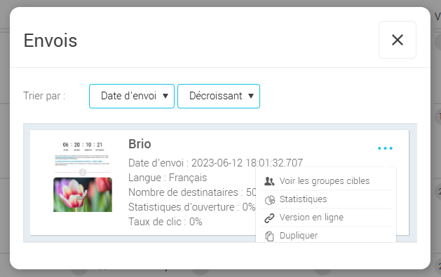 - Cliquez sur un libellé "# envoi(s) précédent(s)" (icône enveloppe orange) dans le Calendrier, puis ouvrez le menu d'actions de celui dont vous souhaitez reprendre le même visuel pour effectuer un nouvel envoi (cliquez sur les ... à sa droite).