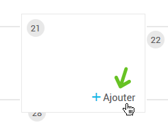 - Cliquez sur le bouton "+ Ajouter" qui est disponible au début de chaque mois ou pointez votre souris sur la date exacte où vous souhaitez créer l'événement et cliquez sur le "+ Ajouter".