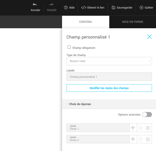 Le panneau Choix de réponse est disponible pour les champs de type boutons radio, cases à cocher ou liste déroulante.