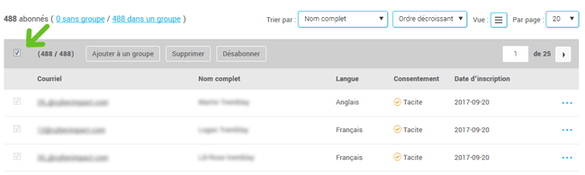 Vous pouvez aussi sélectionner l'ensemble des contacts de la liste (par exemple, l'ensemble du résultat d'une recherche) en cochant la caseen haut à gauche du tableau. Le nombre total des contacts sélectionnés s’affichera entre parenthèses. Attention! Tous les contacts de toutes les pages de la liste ou du résultat de recherche seront sélectionnés, pas seulement ceux de la page visible en ce moment.