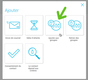 7. Cliquez sur le "+" dans le parcours de votre scénario pour ajouter l'action "Ajouter aux groupes". Sélectionnez ensuite le(s) groupe(s) auquel(auxquels) ajouter vos contacts. Faites ensuite "Ajouter" pour confirmer.