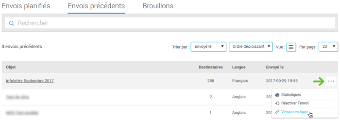 - Cliquez ensuite sur l'option « Version en ligne » du menu d'actions situé à la fin de la rangée de l'envoi désiré. Une nouvelle fenêtre s'ouvrira alors dans votre navigateur pour afficher la version en ligne de votre courriel.