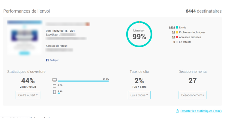 Note : S'il s'agit de votre dernier envoi, la boîte des performances de l'envoi ainsi que le lien d'exportation se trouveront aussi sur votre tableau de bord.