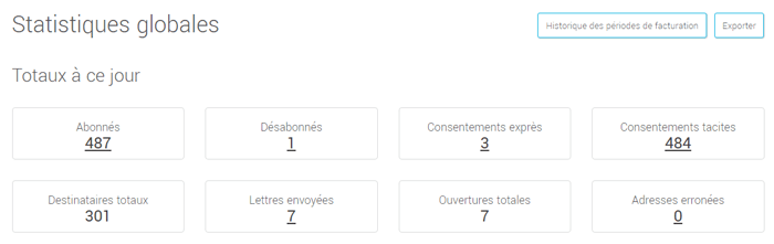 Pour consulter les statistiques globales de votre compte, telles que le nombre d'abonnés, de contacts désabonnés, de consentements exprès ou tacites, d'adresses erronées, des lettres envoyées et du nombre d'ouvertures totales, cliquez sur dans la barre d'outils rapides à la gauche de votre compte.