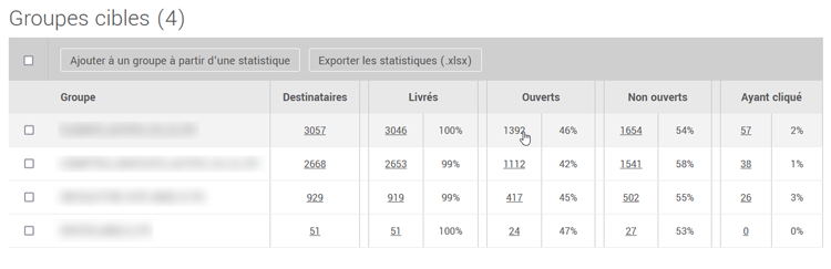 Si vous avez effectué un envoi à plusieurs groupes cibles, il peut être intéressant de comparer les données pour chacun d'eux. Celles-ci sont disponibles dans le tableau Groupes cibles, sous le graphique de perfomance de l'envoi. Vous pouvez cliquer sur les chiffres soulignés dans le tableau pour accéder à la liste des contacts concernés par la statistique.