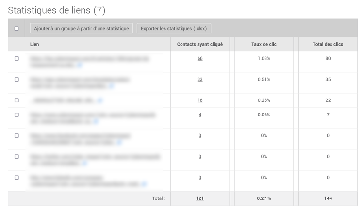 Dans les statistiques détaillées de l’envoi, sous la section Statistiques de liens, une liste de tous les liens du message ainsi que leur nombre de clics sont affichés. En cliquant sur ce chiffre, vous pouvez savoir précisément quels contacts ont cliqué sur chaque lien.